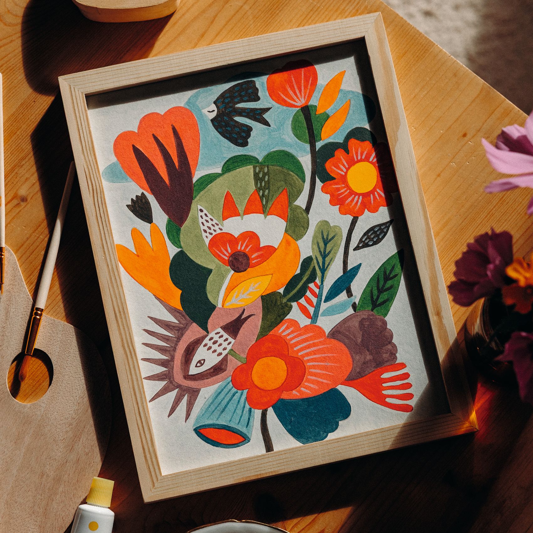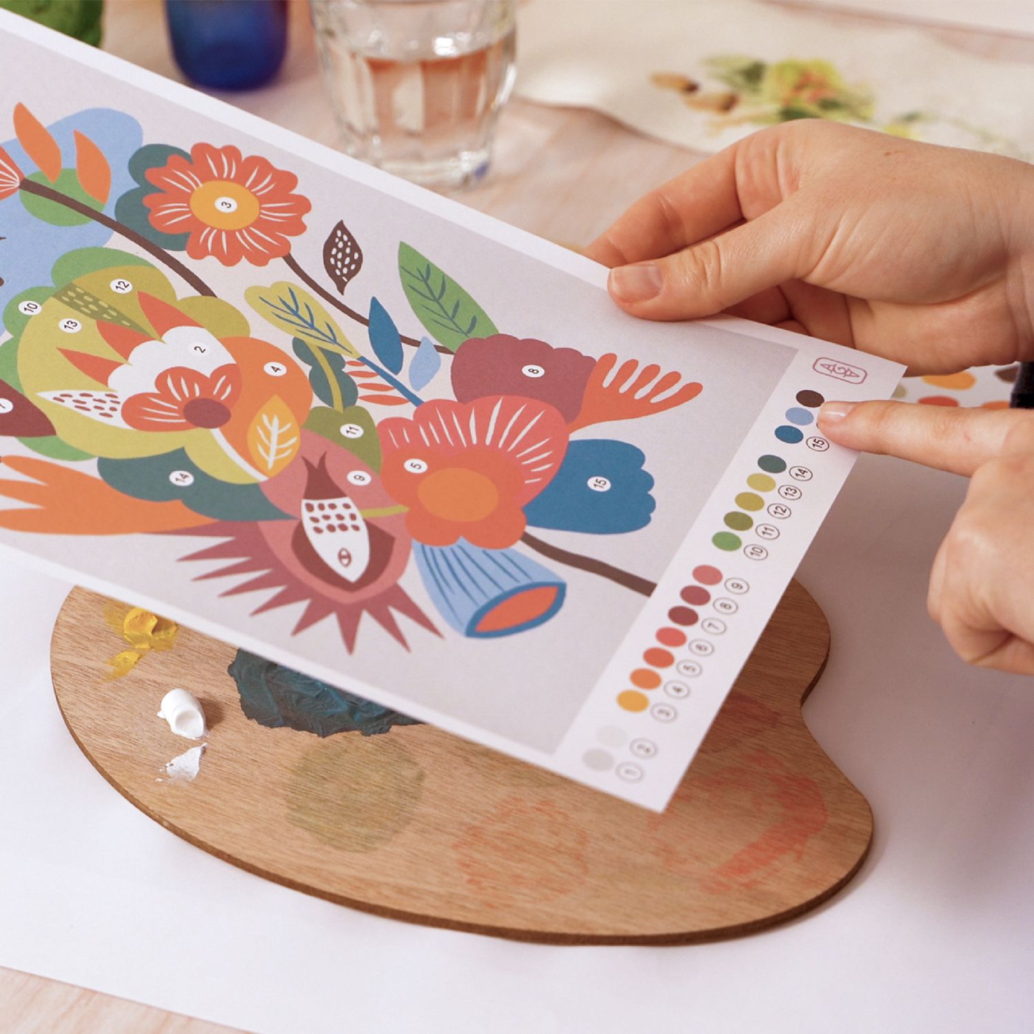Sur une toile imprimée avec les contours de l’illustration, explorez les mélanges de couleurs, les textures et les gestes.